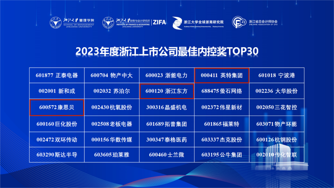 近日,由浙江大學(xué)管理學(xué)院、浙江大學(xué)財務(wù)與會計研究所、浙江大學(xué)全球浙商研究院和浙江省總會計師協(xié)會聯(lián)合主辦的第七屆上市公司高質(zhì)量發(fā)展論壇暨2023年浙江上市公司內(nèi)部控制指數(shù)發(fā)布會順利舉行。會議發(fā)布了《2023浙江上市公司內(nèi)部控制指數(shù)報告》,并揭曉了2023浙江上市公司最佳內(nèi)控三十強榜單。集團(tuán)下屬英特集團(tuán)、浙江東方、康恩貝上榜,分別榮登TOP4、TOP8、TOP11。