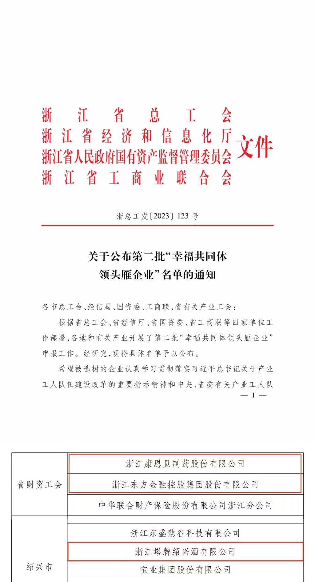 近日,浙江省總工會、浙江省經(jīng)濟和信息化廳、浙江省人民政府國有資產(chǎn)監(jiān)督管理委員會、浙江省工商業(yè)聯(lián)合會聯(lián)合公布第二批“幸福共同體領(lǐng)頭雁企業(yè)”名單,集團下屬浙江東方、康恩貝股份、塔牌紹興酒成功入圍。